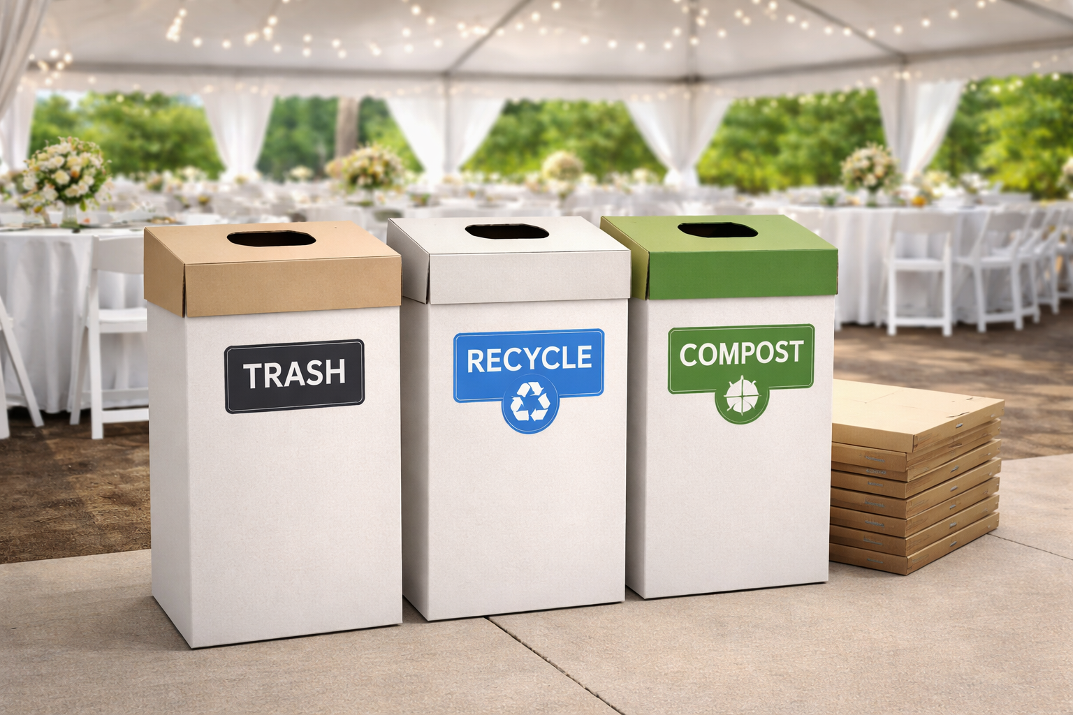 They’re box-style containers made from cardboard. Many buyers search “cardboard trash cans,” but the product is a foldable cardboard trash box that functions like a can at an event.